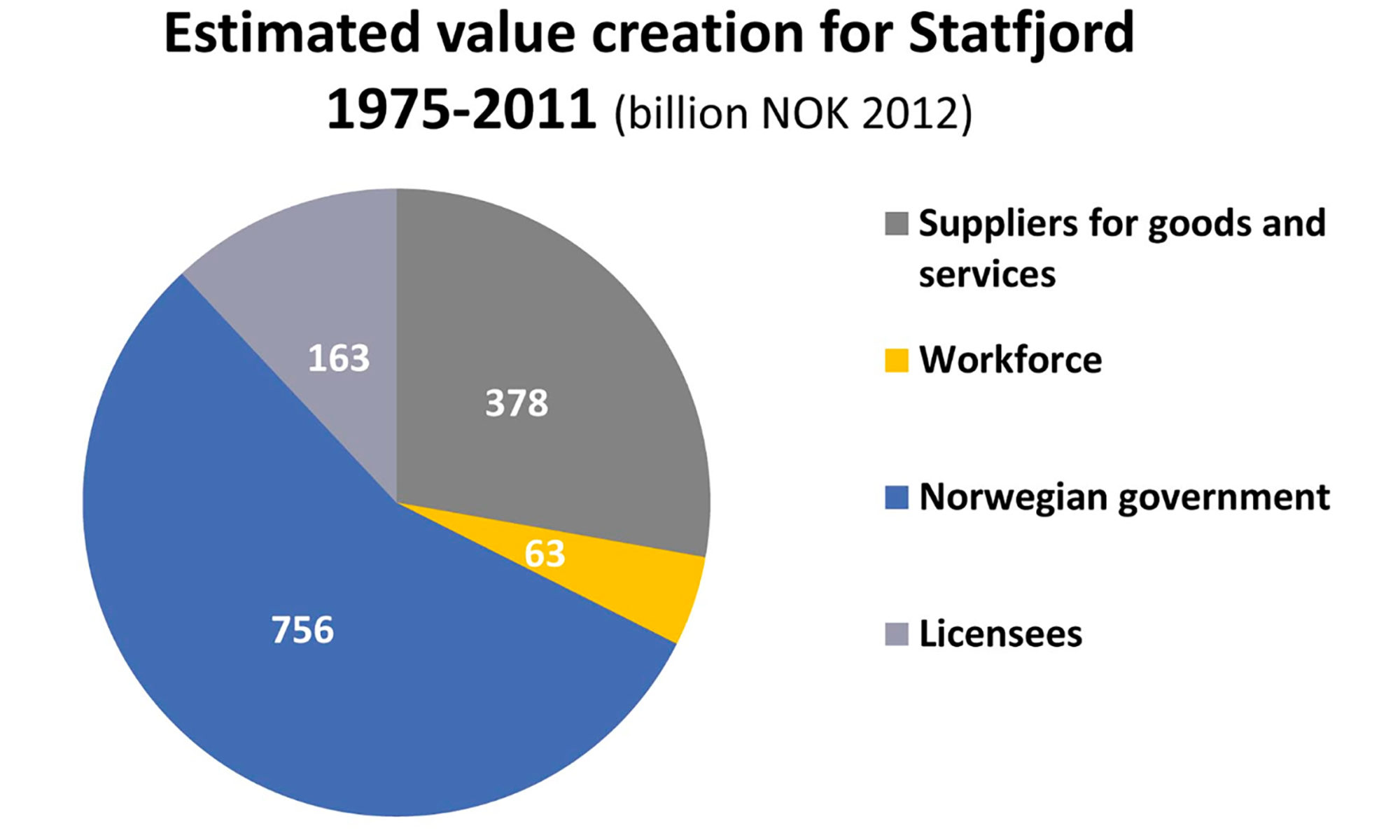 This has benefited the Norwegian government with 756 billion NOK, the licensees with 163 billion NOK, the workforce with 63 billion NOK and the financial institutions and the suppliers of goods and services for development and operation of the field with 378 billion NOK.