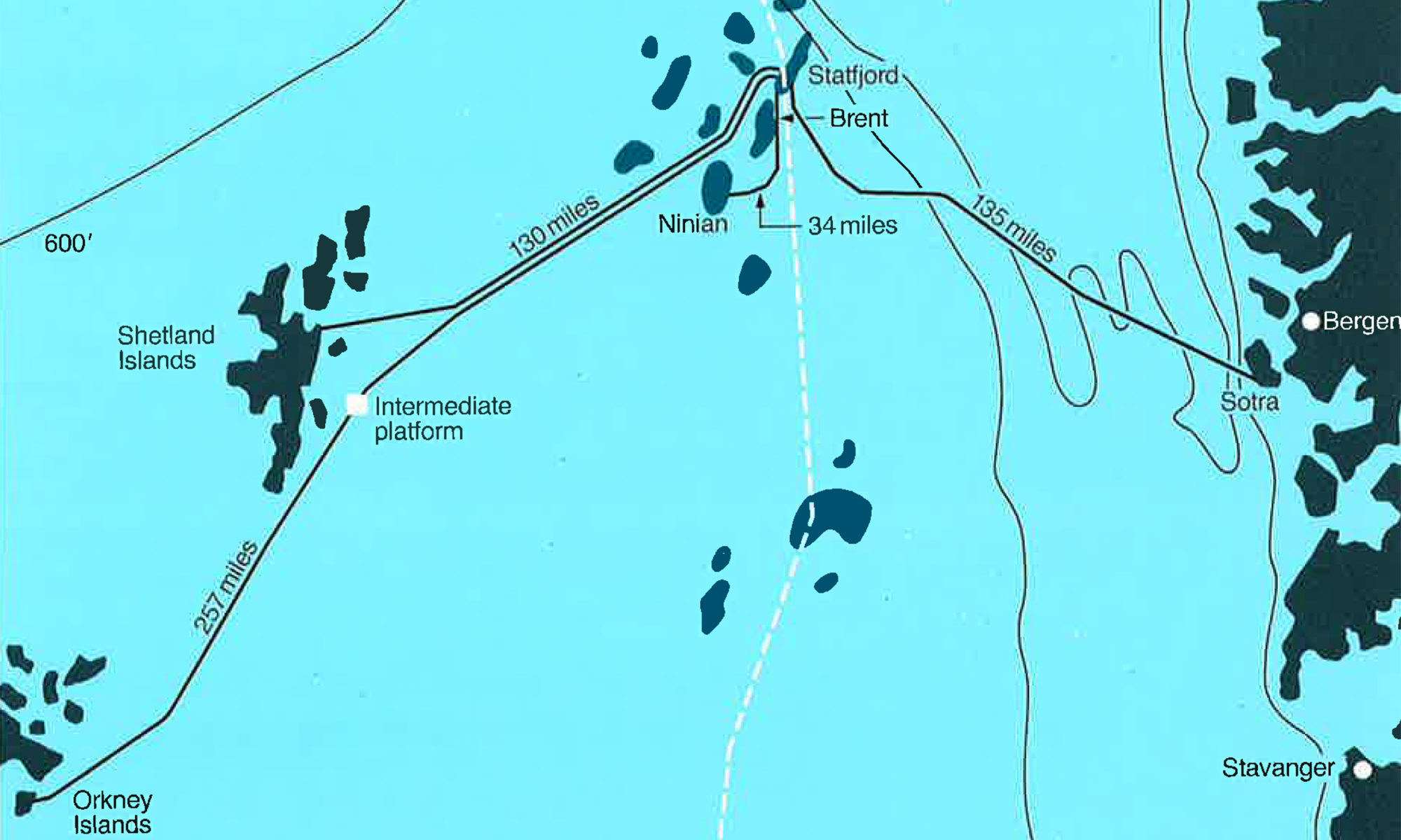 — Alternativer for oljerørledning fra Statfjord. Illustrasjon fra brosjyren Statfjord Field utgitt av Mobil.