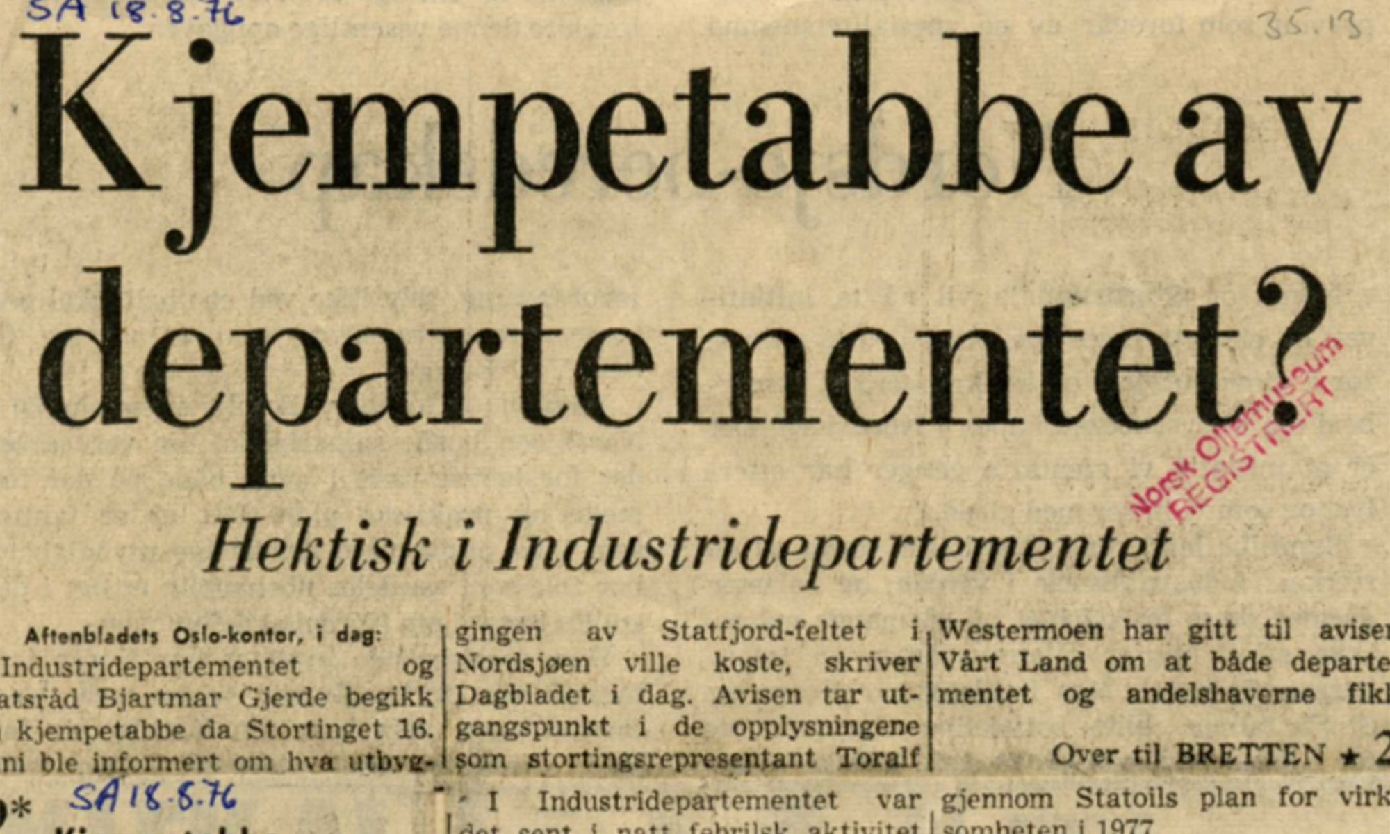 Da Stortinget behandlet feltutbyggingsplanen for Statfjord forelå det fra Statoil/Mobilgruppen et brev av 3. juni 1976 som fortalte at kostnadene ble vesentlig større enn antatt. Industriminister Bjartmar Gjerde kjente ikke til brevet da han gikk på Stortingets talerstol for å gi sin støtte til de store utbyggingsplanene. Brevet lå i et skap i hans departement.
