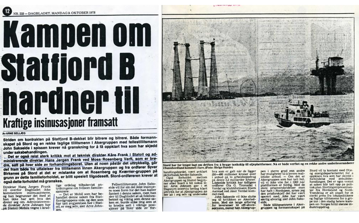 Det var en oppfatning avisen delte med de fleste, alt så ut til å ligge til rette for et nytt stort oppdrag til Aker. I november kom avgjørelsen som startet 1970-tallets største industrikrangel. Kontrakten til bygging av dekket til Statfjord B ble gitt Kværnerkonsernet og Moss Rosenberg Verft i Stavanger.